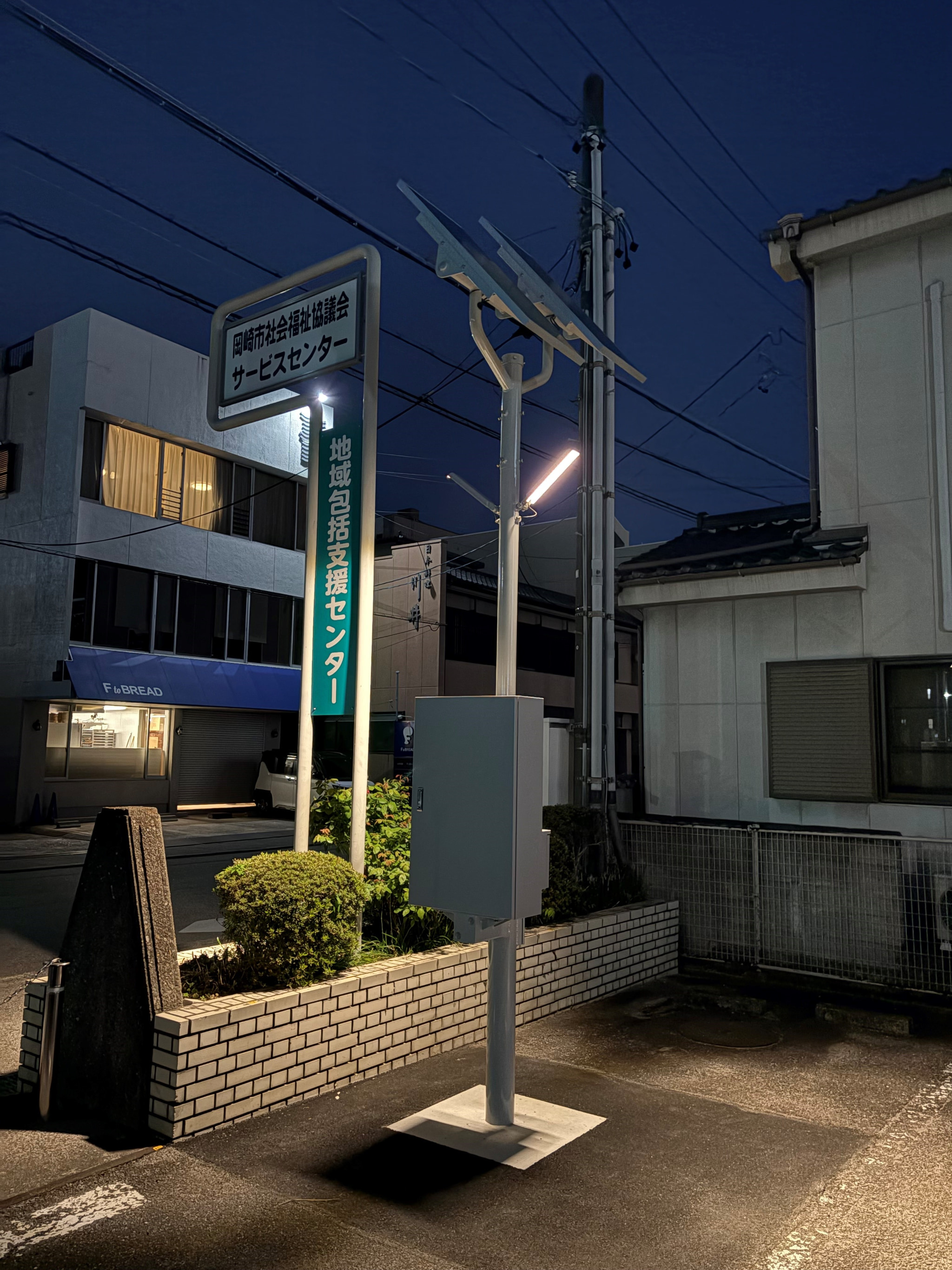 初号機の設置場所である岡崎市社会福祉協議会サービスセンターは、福祉の相談窓口やフードバンク事業を行っていることから、岡崎市のボランティア活動の拠点の1つとなっており、設置によって特に災害時における地域防災力の向上が期待できます。今後岡崎市としては、公共施設を中心に自律型街路灯設置を進め、脱炭素化、防災の強化に役立てていく予定です。
