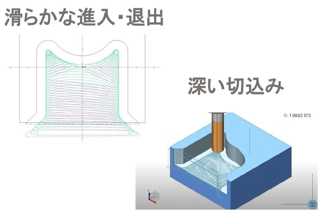 高速加工を可能にするツールパスで粗取り時間を短縮できます。深いZピッチと速い送り速度、鋭角なコーナーへの滑らかな進入退出をするツールパスでの高速加工が可能です。刃長を最大限に活用し、工具への負荷を減らすことで工具寿命を延ばします。 |