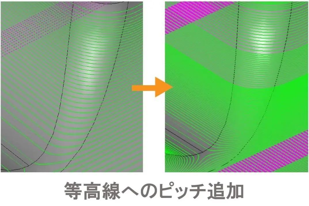 等高線・走査線のツールパスに対して任意の箇所にピッチを追加することができます。形状によりピッチが粗くなることを避けるため、急斜面や緩斜面も継ぎ目のない仕上がりにできます。 |