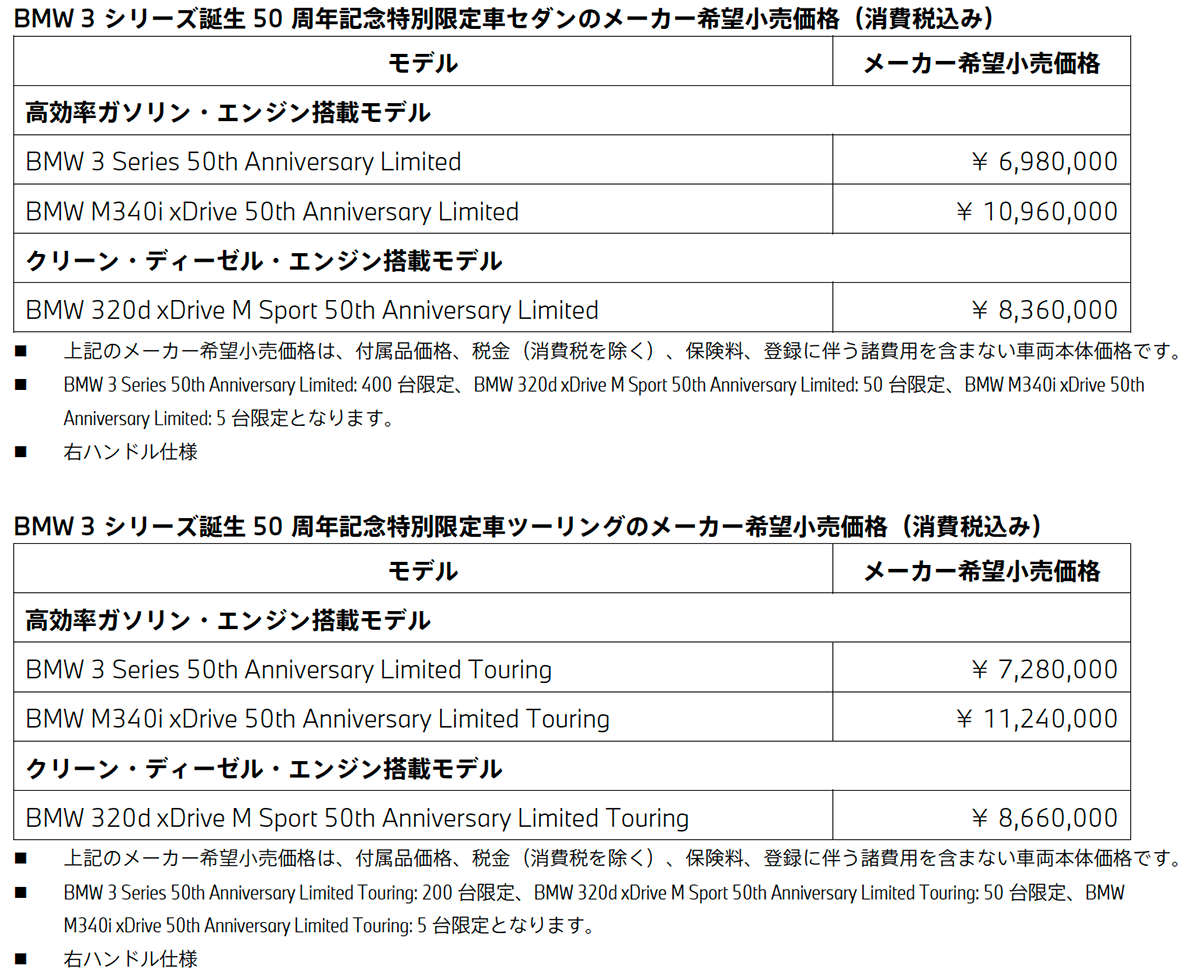 BMW 3 シリーズの限定車「BMW 3 シリーズ誕生50 周年記念特別限定車」を発表