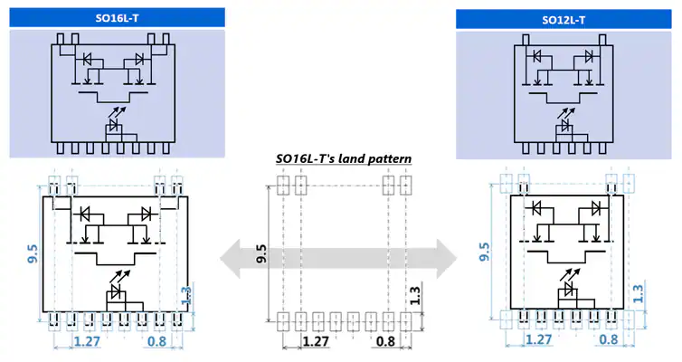 ![]() 図 1. SO16L-TとSO12L-Tのピン配置とランドパターンのイメージ図 |