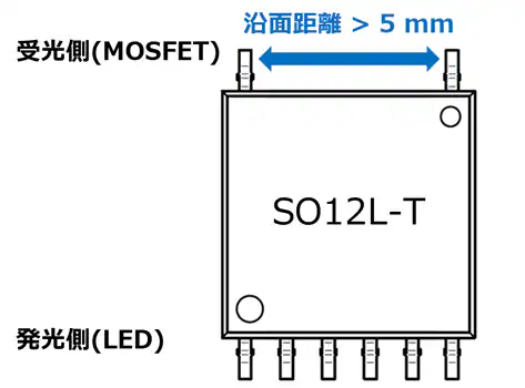 また、SO12L-Tパッケージには、国際規格IEC 60664-1[注3]の材料グループⅠ[注4]に該当する、比較トラッキング指数 (CTI[注5]) が600以上の樹脂を採用し、受光側の沿面距離5mm以上[注6]を確保しています (図2)。これにより新製品はIEC 60664-1に準拠し、使用電圧1000V対応を可能にしました。