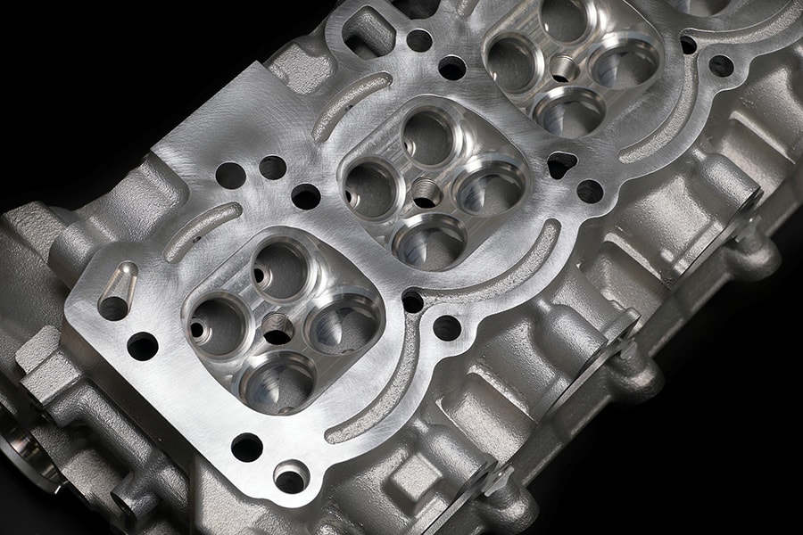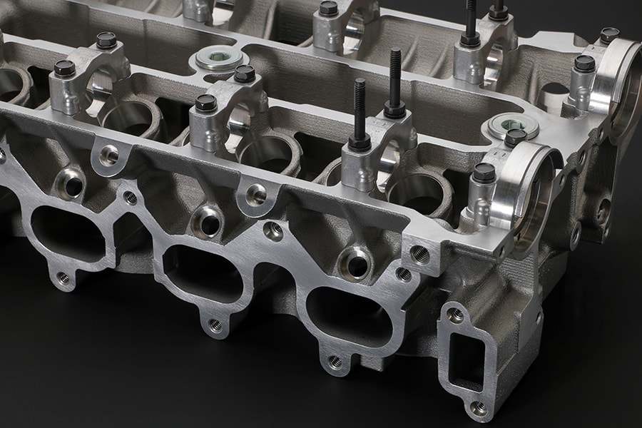 燃焼室に切削加工を追加し、鋳肌をそのまま残した部分の面積を減らすことで、圧縮比のばらつきから生まれるエンジンごとの個体差を低減しました。吸気ポートには塗型処理を施し、未加工の状態での表面の凹凸を軽減しています。オリジナル部品では一部箇所のみで使用されていたカムキャップのノックピンを全箇所に追加することで、組付時の作業性を改善しました。