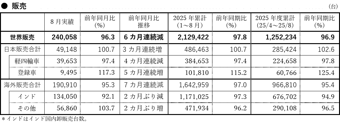 スズキ 2025年8月 四輪車生産・販売・輸出実績