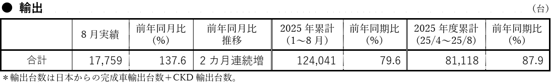 ・ 完成車輸出、CKD輸出がともに増加し、前年同月実績を上回った。