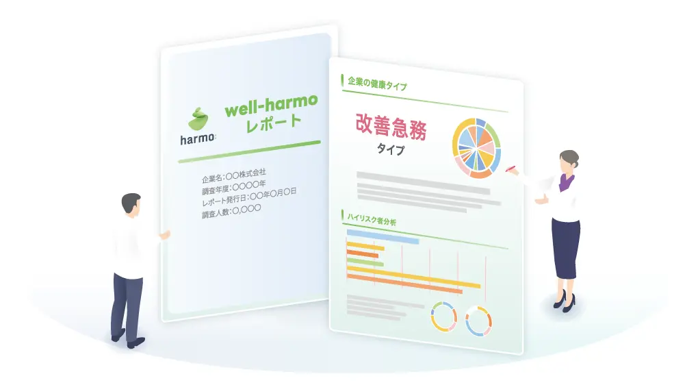harmoが提供する「well-harmoレポート」は、企業が保有する従業員の健康診断データを基に、企業全体の健康状態や事故リスクをスコア化。専門家が経営層に直接レポート内容を解説し、組織的な健康課題の把握と具体的な対策実行までをワンストップで支援します。