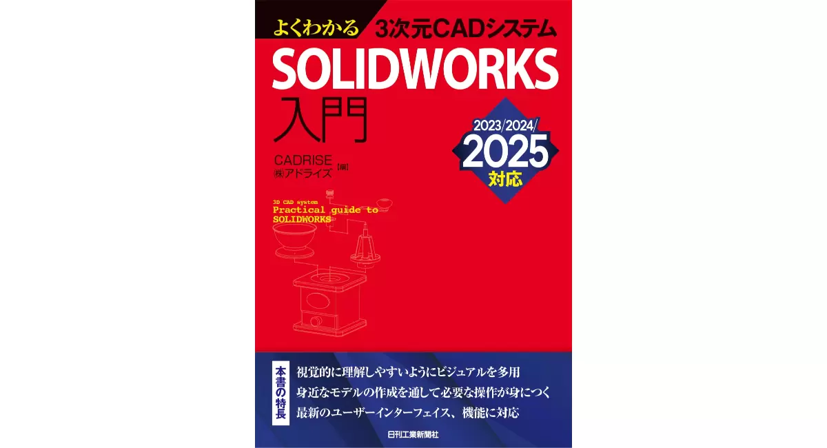 株式会社アドライズ(本社:長野県下諏訪町、代表取締役:牛山直樹)は、3次元CADソフト「SOLIDWORKS」の初心者向け入門書『よくわかる3次元CADシステムSOLIDWORKS入門2023/2024/2025対応』を2025年8月31日に日刊工業新聞社より発売します。本書は最新バージョンに対応し、初心者でもスムーズに学べるようビジュアルを多用し、身近なモデルを通じて基礎から習得できる構成です。製造業でCADスキルの重要性が増す中、アドライズは設計支援事業で培った知見を活かし、実用的かつ短期間での習得を可能にする教材を提供します。