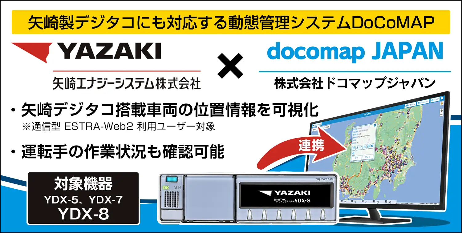 株式会社ドコマップジャパン(本社:東京都港区、代表取締役:浦嶋一裕、以下 ドコマップジャパン)は、矢崎エナジーシステム株式会社(本社:東京都港区、代表取締役社長:矢﨑 航、以下 矢崎)が提供するYDXシリーズ※1の通信型デジタルタコグラフ端末から取得される情報を、モビリティサービスジャパン株式会社(本社:大阪府大阪市、代表取締役:浅羽 信宏、以下 モビリティサービスジャパン)の協力を得て、ドコマップジャパンの「DoCoMAP※2(ドコマップ)」と連携し2025年9月より提供を開始しました。