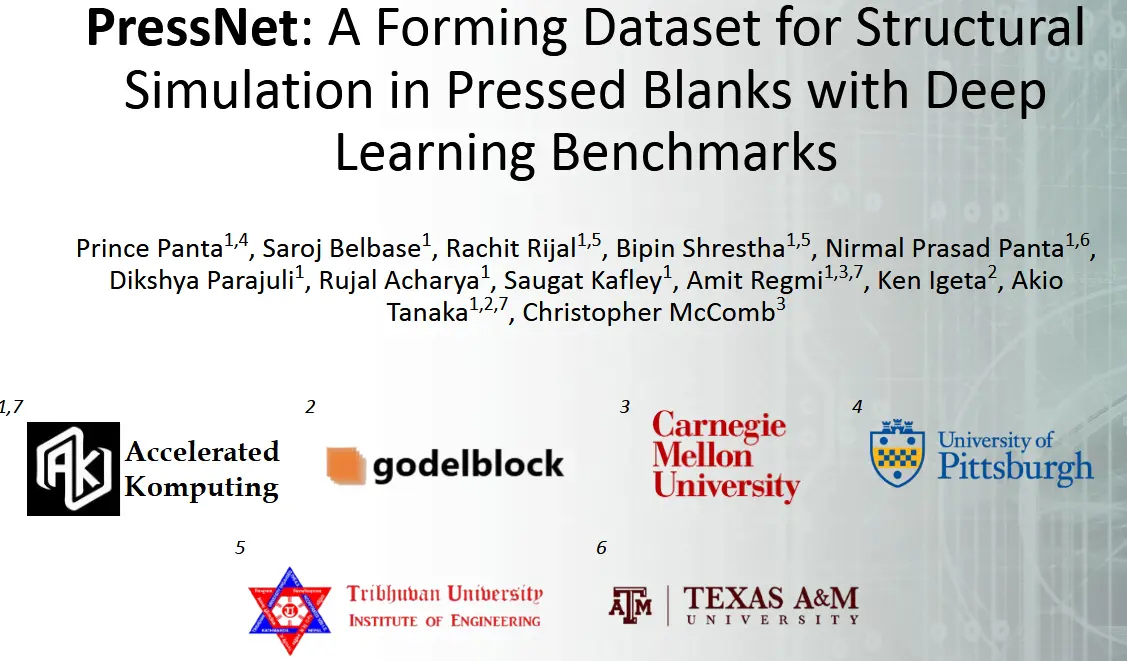 2025年8月20日、カリフォルニア州アナハイム - Accelerated Komputing社は、株式会社ゴーデルブロック、カーネギーメロン大学等との国際共同研究により開発した、プレス成形プロセス用の包括的な3Dデータセット「PressNet」に関する論文を、ASME 2025国際設計工学技術会議・コンピュータ情報工学会議(IDETC/CIE2025)にて発表しました。