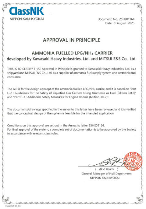 川崎重工は、アンモニア燃料主機及びアンモニア燃料供給装置のサプライヤーである株式会社三井E&Sと共同で、液化アンモニアを舶用燃料として使用可能なLPG/アンモニア運搬船の基本設計承認(AiP : Approval in Principle)を一般財団法人日本海事協会(ClassNK)より取得しました。※1