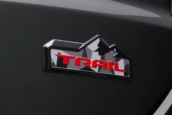 特に、フロントフェイシア下部(フロントバンパー下部)に施されたレッドアクセントは、道行く人々の注目を集めることでしょう。また、従来のクロームアクセント部位に、本限定車専用の「ニュートラルグレー」と「グロスブラック」を採用して、リアには、カモフラージュ柄にレッドの「TRAIL」文字が際立つ専用バッジを装着しました。落ち着いたブラック&グレーの装いにレッドのアクセントの効いた、個性的なデザインです。