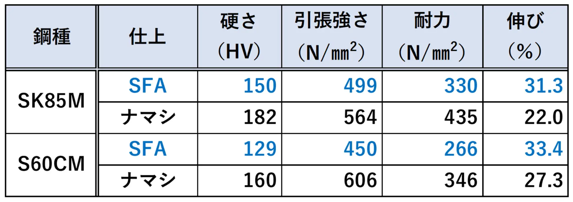 一般のナマシ仕上品に比べて軟質(低耐力)でありながら、優れた延性を実現しております。(表1)