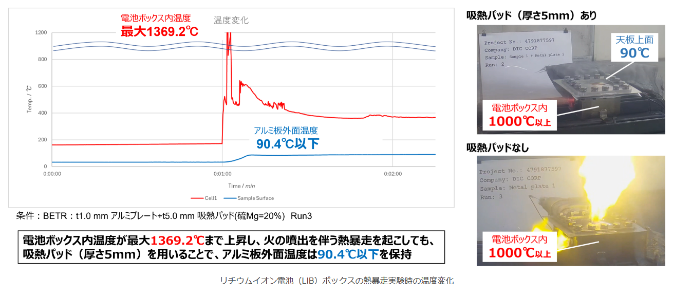 UL2596*³BETR試験では、多数のセルが入ったボックス内で熱暴走を起こしたときの状態とその温度変化について検証し、LIB内部温度が最大1369.2℃まで上昇し、火の噴出を伴う熱暴走を起こしても、吸熱パッド(厚さ5.0mm)を用いることで、アルミ板外面温度は90.4℃以下を保持しました。