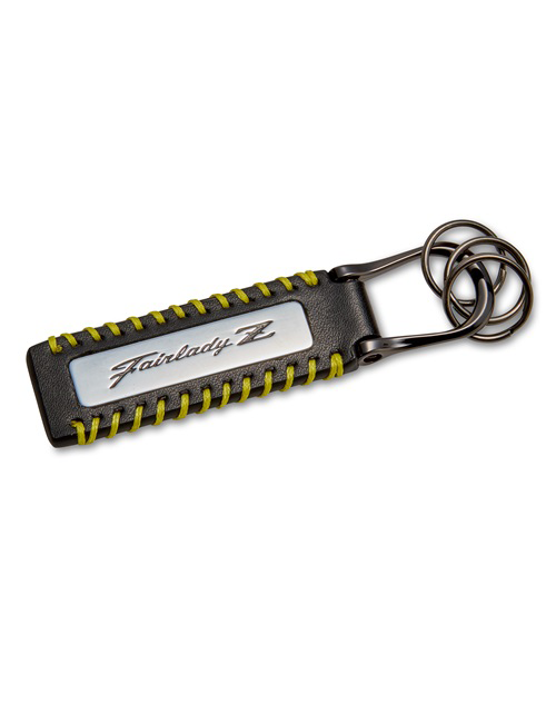 Fairlady Zのロゴがプリントされたメタルプレートと、レザーを組み合わせたキーリングです。ロウ引き糸のステッチで車体色を表現しました。オレンジ・ブルー・イエローの3色展開です。