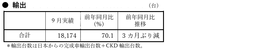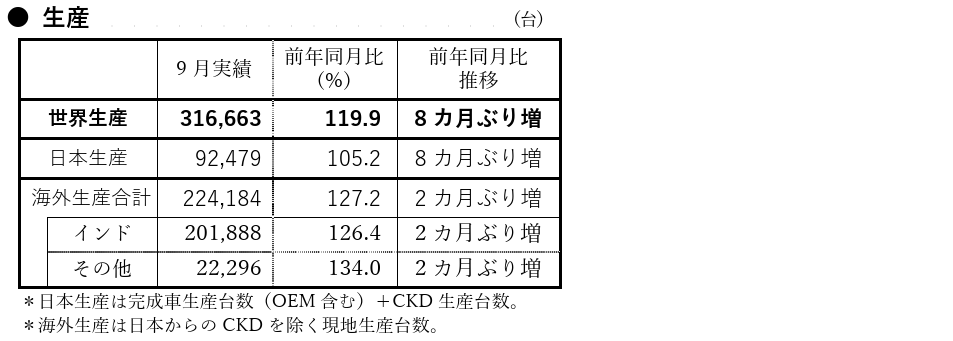・海外生産:ハンガリーは減少したが、インド、インドネシアなどが増加し、前年同期実績を上回った。なお、インドは4~9月で過去最高となった。