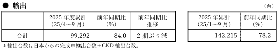 ・日本生産:日本向け、輸出向けがともに減少し、前年同期実績を下回った。
