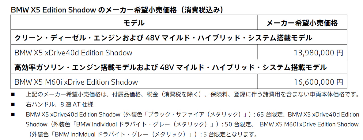 ビー・エム・ダブリュー株式会社(代表取締役社長: 長谷川正敏)は、BMW X5(エックスファイブ)の限定車「BMW X5 Edition Shadow(エディション・シャドー)」の注文の受付を10 月16 日まで、全国のBMW正規ディーラーにおいて実施する。日本全国120 台限定での導入となり、納車開始は、本年10 月からを予定している。