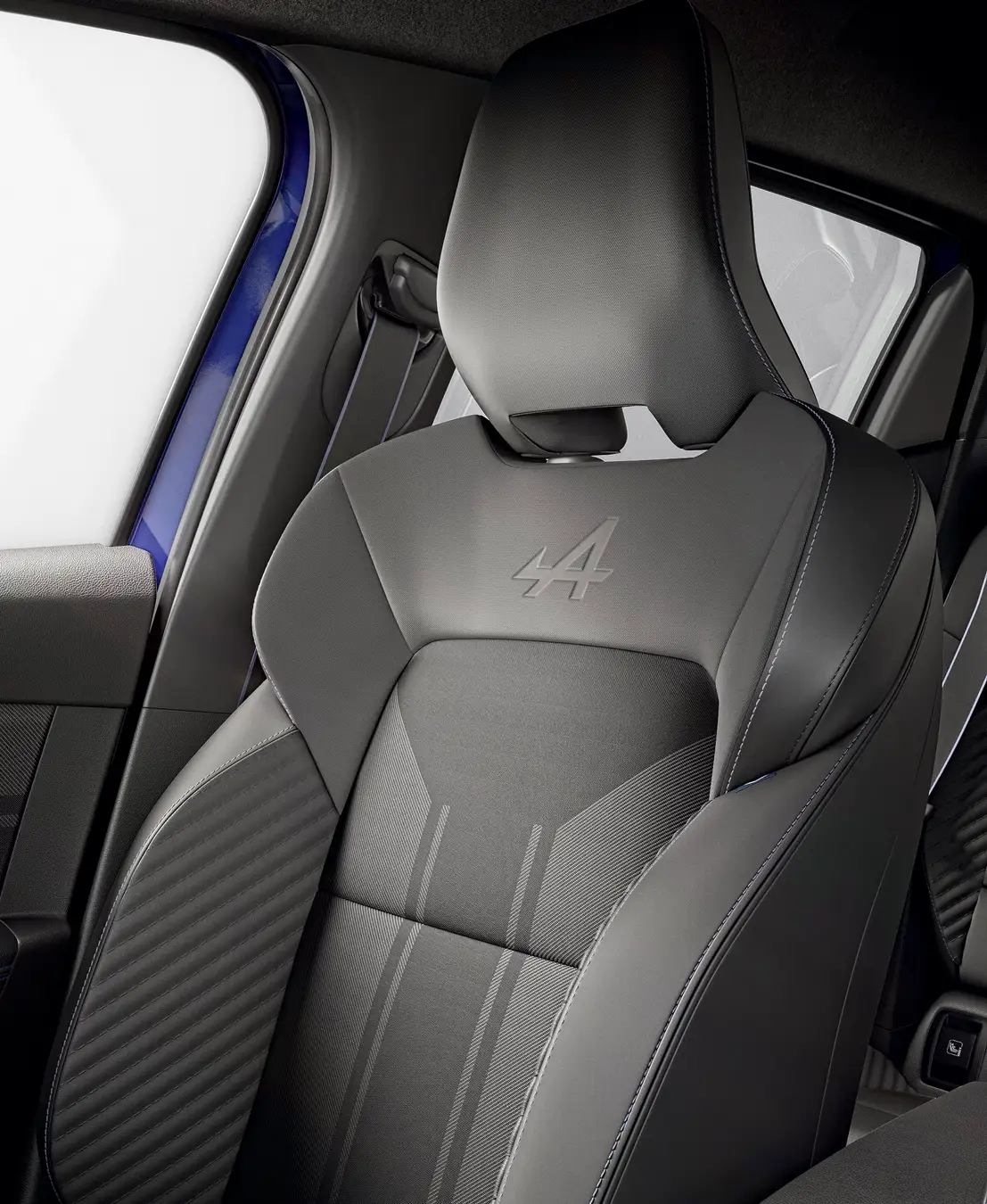 新しくなったシートはサポート性に優れた形状で、バイオスキン×ファブリックのコンビ素材を採用し(前席シートヒーター付)、快適に長距離ドライブが楽しめます。シートバックには、アルピーヌのロゴが入ります。