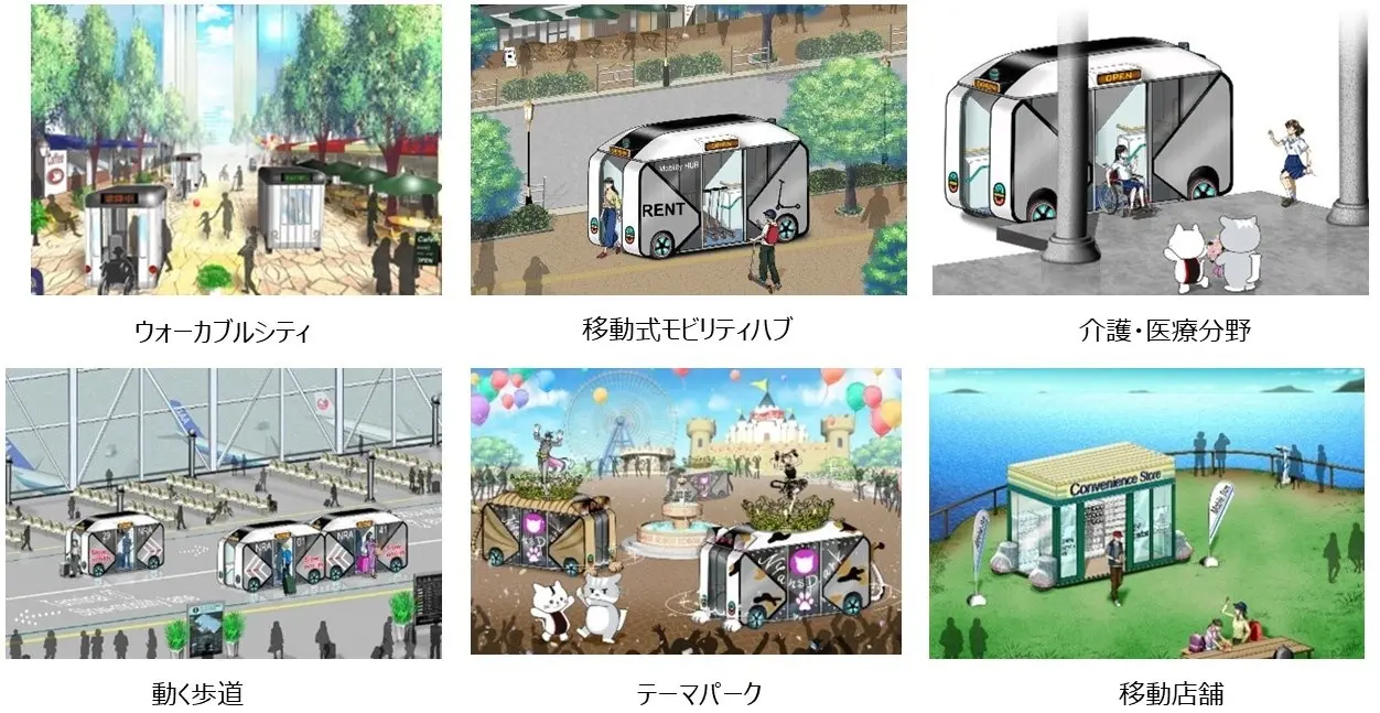 これらの特徴を活かし、ウォーカブルシティでの利用にとどまらず、移動式モビリティハブ、介護・医療分野での活用など、様々なニーズに貢献できるソリューションの提供が可能となります。ユニットを後付け・付け替えすることにより、移動店舗や倉庫の移動などでの活用も考えられます。