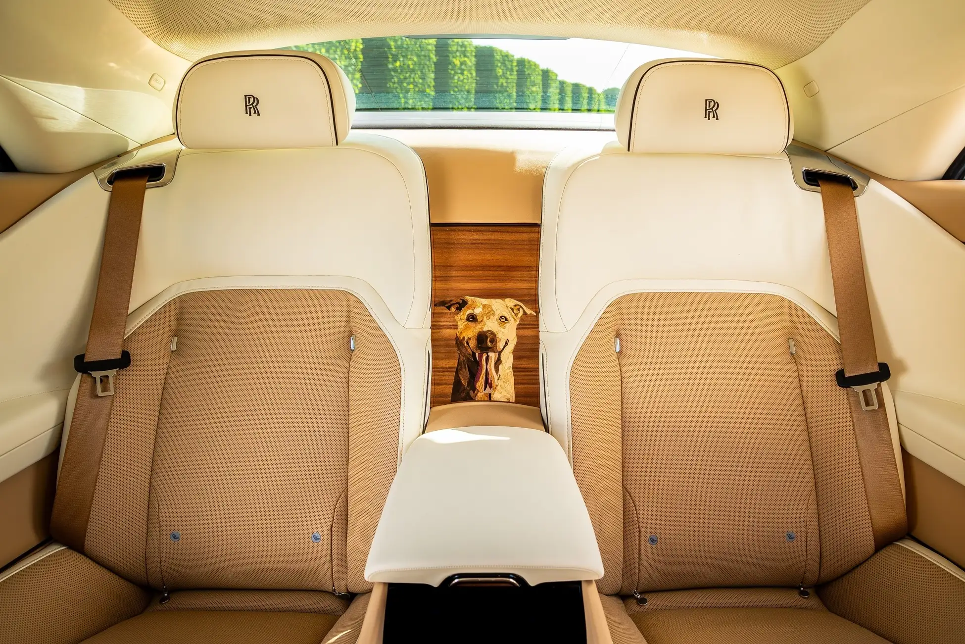 インテリアの中心となるのは、後部座席の間のウォーターフォールに配された、生き生きとしたベイリーの姿を描いた寄木細工の肖像です。この精巧なアートワークは完成までに4か月以上を要し、180枚を超えるベニヤを組み合わせて製作されました。ベイリーの毛並みの温もりと質感を表現するため、職人たちは多種多様な天然のベニヤを探究し、木目の方向、色調、質感を組み合わせて試行を重ねました。自然な色合いと模様を基準に一枚一枚選定され、染色や人工的な処理は一切施されていません。ベイリーの舌の表現には、ロールス・ロイスではこれまで使用されたことのない4種類のベニヤ(パープル・ハート、チューリップウッド、ラウロ・ファイア、ペア)を組み合わせて、微妙な色調の変化を表現しています。最終的には9種類のベニヤが用いられ、22の自然な色調を活かすことで、驚くほどの温かみと写実性を兼ね備えた肖像が完成しました。