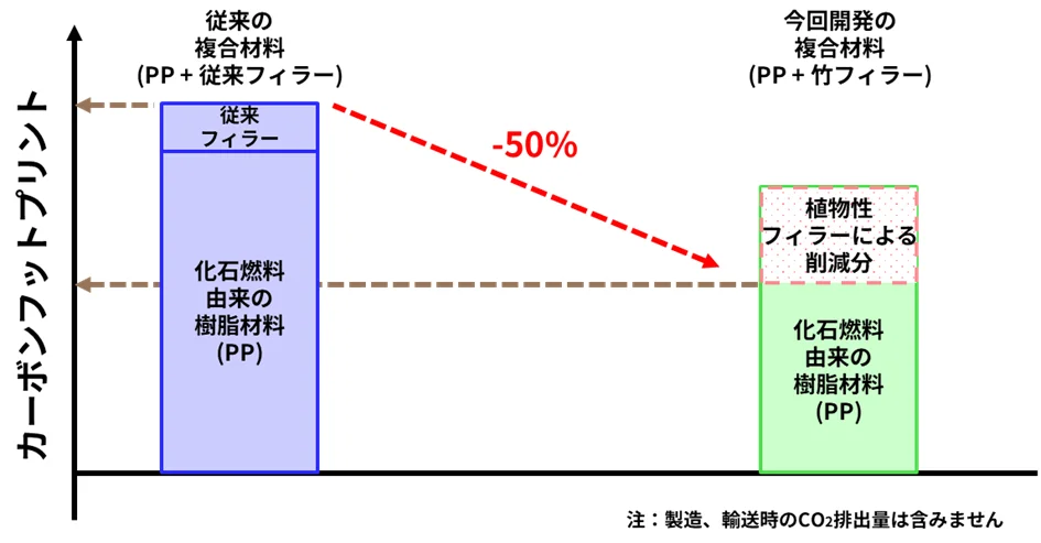 ポリプロピレン(PP)とタルクやグラスファイバーとの複合材料など、従来から用いられている化石燃料由来の樹脂材料は、高い信頼性と性能を提供しますが、利用に伴う炭素排出量の増加が課題でした。2050年のカーボンニュートラル実現と、自動車分野でのサーキュラーエコノミー(循環型経済)を推進するため、従来のポリプロピレン/タルク複合材料の代替品として、植物性フィラー(竹)を用いたポリプロピレン/竹複合材料を開発しました。開発した複合材料は、植物性フィラーの利用による樹脂を減らす効果に加えて、竹が吸収した二酸化炭素を、「缶詰」のように内部に保持できるため、約50%のカーボンフットプリント削減と、従来同等以上の機械的性能を両立します。