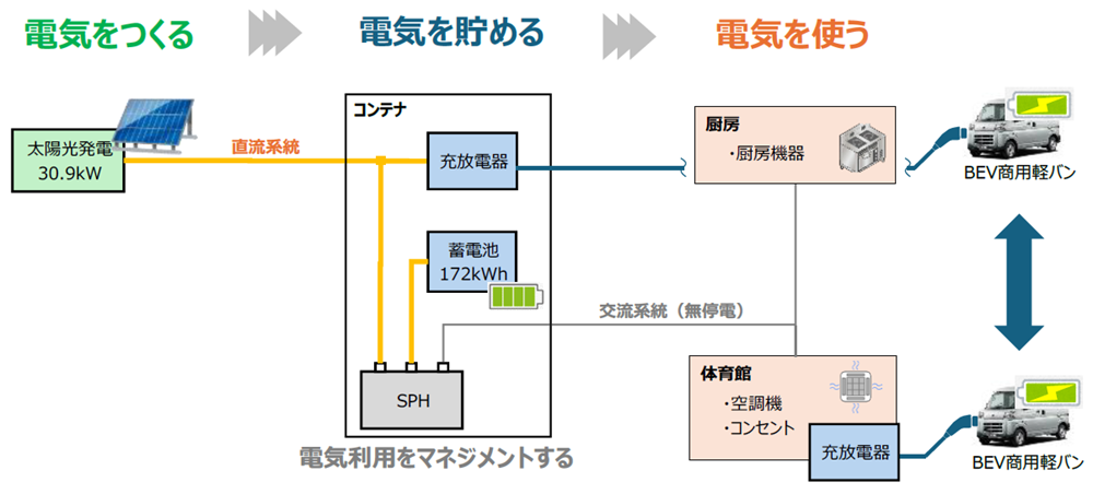 前田建設の「ICI-Camp」において、太陽光発電で作られた電気を体育館および食堂に電力を供給し、余った電気は蓄電池や「BEV商用軽バン」のバッテリに蓄電。