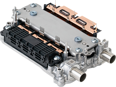 BEV*1やPHEV*2の心臓部ともいえるインバーターは、動力源であるモーターを駆動するために、電池からの直流電流を交流電流へ変換する重要な役割を担っています。航続距離の延伸と走行性能の向上を両立させ、さらに車室内空間確保のための自由な搭載ニーズに応えるため、インバーターは体格を抑えつつ、電力損失や発熱を抑制し、大電流に対応する性能が求められています。 このような技術課題に対応するため、デンソーはこのたび、得意とする両面冷却技術をベースに、冷却設計やパワー半導体などの強みを融合させた新たな平置き両面冷却構造のインバーターを開発しました。SiC(シリコンカーバイド)パワー半導体やその周辺回路・構造設計、高冷却技術などの各要素技術をさらに進化させるとともに、それらを最適に組み合わせる統合技術により、体格を抑えながらも飛躍的な高効率化を達成し、世界最高の出力密度*3(体積(L)あたりの出力(kW))を実現しています。インバーターの電力損失は、Si(シリコン)を採用した当社従来製品と比較して、約70%低減しました。また、主に半導体と冷却水路で構成される本製品の中核を担うコアモジュールにおいては、約30%の小型化を達成しています。 当製品の技術進化により、BEVの航続距離の延伸と走行性能の向上に貢献しています。