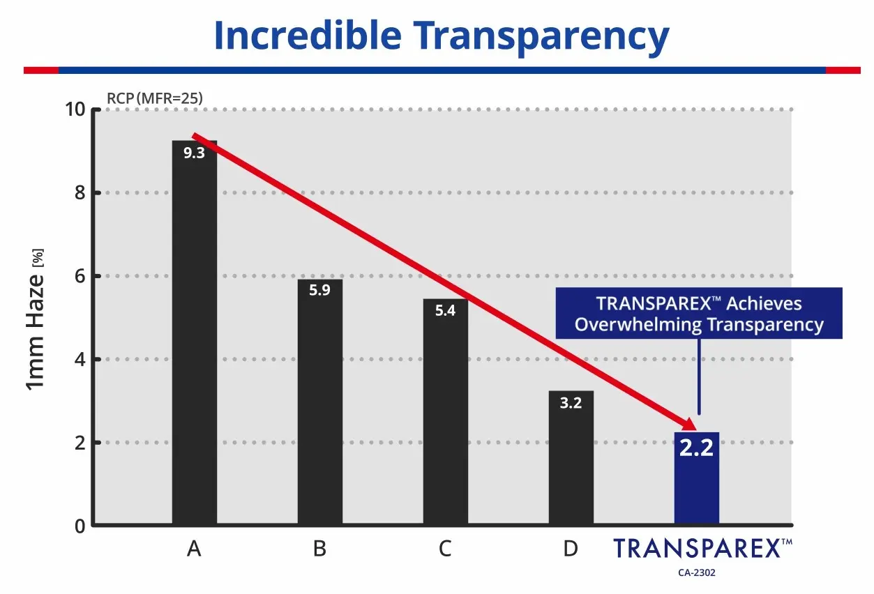 TRANSPAREX™は、これまで実現できなかったガラスのような“透明性”をPPに付与できる新規高性能透明化剤です。この度、TRANSPAREX™が市場で用いられる複数の透明化剤と比較して圧倒的な透明性を付与することが第三者試験機関により実証され、ギネス世界記録™に認定されました。