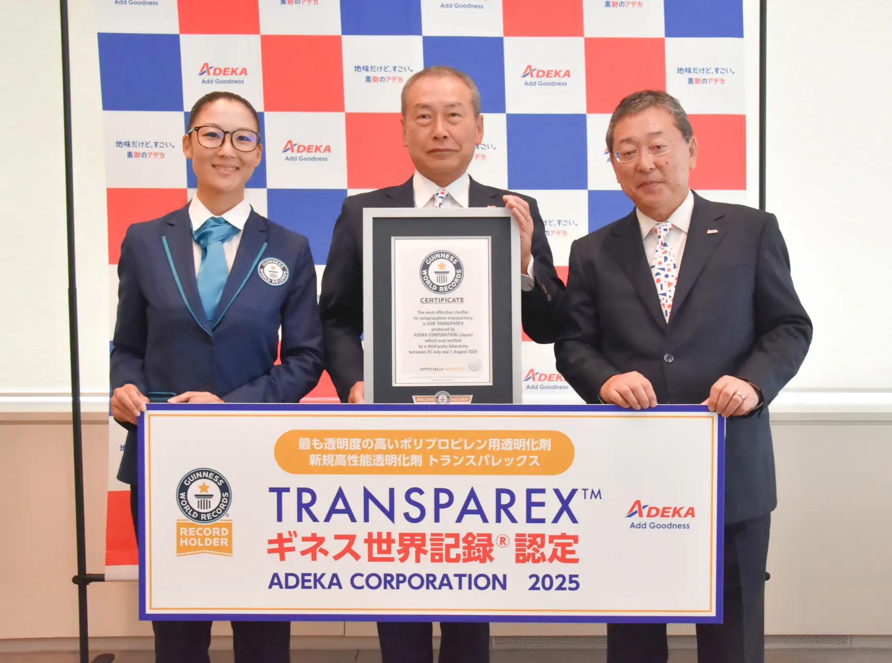 株式会社ADEKA(代表取締役社長兼社長執行役員: 城詰秀尊、本社:東京都荒川区)が手掛ける新規高性能透明化剤「トランスパレックス™(TRANSPAREX™)」が「最も透明度の高いポリプロピレン用透明化剤」として2025年ギネス世界記録™に認定されましたのでお知らせいたします。