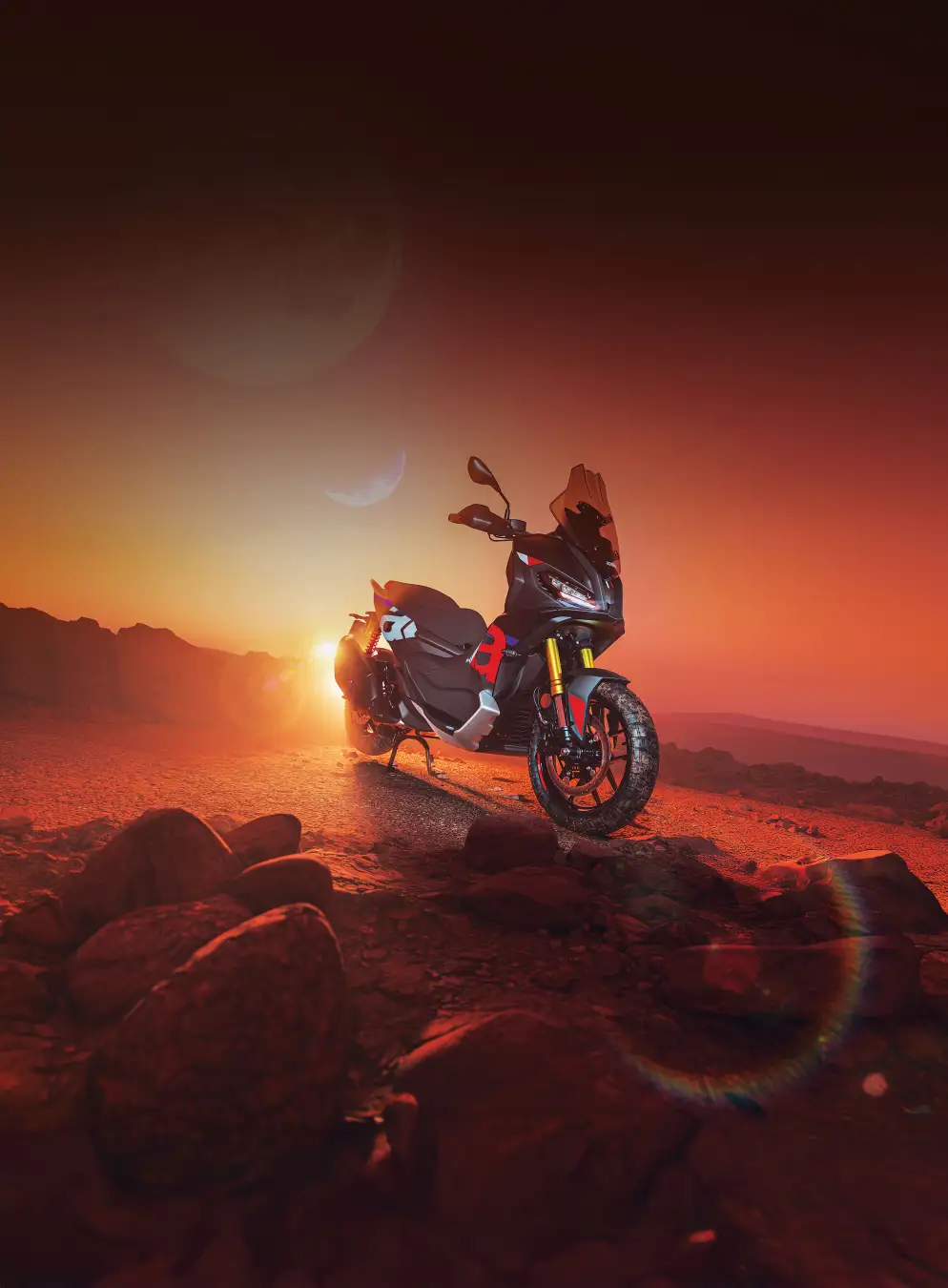 SR GT 400 – アプリリアのモーターサイクルの伝統を受け継ぎ、パワフルで先進テクノロジーを搭載した、アドベンチャーコンセプトのミドル GT スクーター。 |