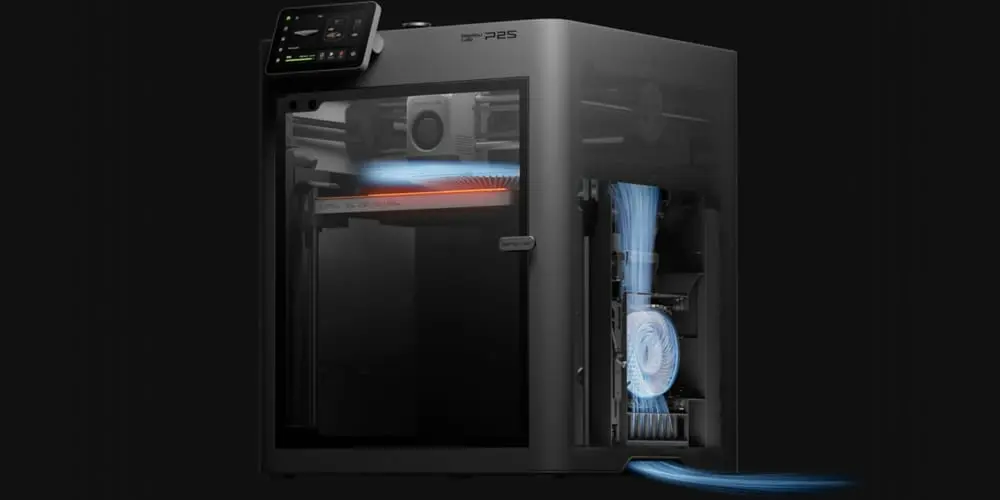 P2Sは、フラップ制御のアダプティブエアフローシステムを搭載しており、チャンバー内の熱を効率的に密閉すると同時に、高性能カーボンフィルターを通して内部の空気を積極的に濾過します。これにより、作業スペース内のクリーンで安全な空気を維持しながら、反りが発生しやすい高難度のエンジニアリングフィラメントを安心してプリントできます。