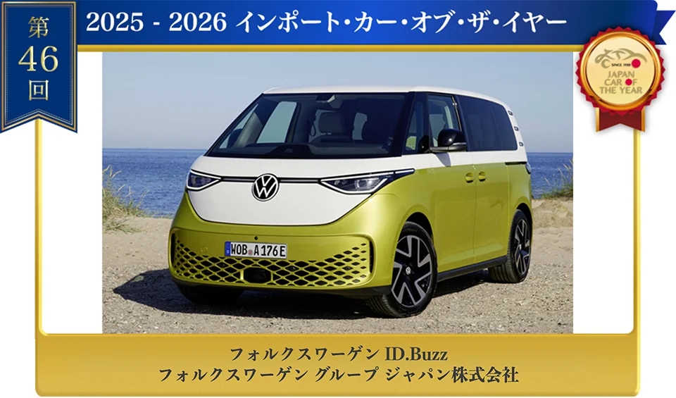フォルクスワーゲン ID.Buzz は、BEV(電気自動車)のフルサイズミニバンという、現在国内市場では唯一無二の存在であり、BEVとしての完成度も極めて高い。電気自動車ならではのパッケージングが、ミニバンとしてゆとりある居住空間を実現し、BEVミニバンという新たなカテゴリーを切り開いた。さらに、“ワーゲンバス”として親しまれたType 2の魅力を現代的に継承したエクステリアデザインは、運転者のみならず周囲の人々までも笑顔にする存在感を放ち、高い評価を獲得した。