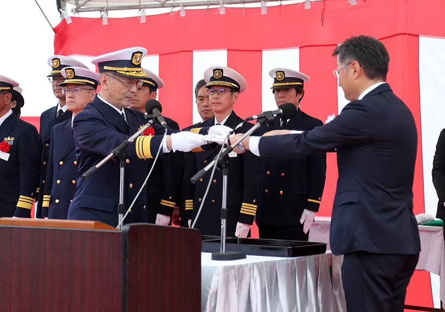 式典には、梶田 智弘 装備技術部長をはじめとする海上保安庁関係者が列席、三菱重工業からは阿部 康史 艦艇・特殊機械事業部長らが出席し、引渡書および受領書の授受などを行いました。