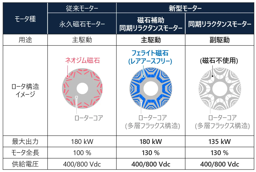 具体的に、BEVの駆動力として常時使用する主駆動モーター向けには、フェライト磁石を補助的に埋め込んだ磁石補助同期リラクタンスモーターによって、従来の永久磁石モーターに対してサイズ増加を30%に抑えながら180kWの出力を実現しました。一方で、BEVのパワーアシストとして必要な時だけ動かす副駆動モーターでは、磁石を埋め込んでしまうと、主駆動モーターによって惰行回転している時に磁石の磁力がブレーキとして働き、エネルギーロスが発生します。このため、副駆動モーター向けには、磁石を一切使用しない同期リラクタンスモーターを開発し、最大135kWまでの出力をカバーすることで、BEV駆動システム全体の消費電力を抑制しました。