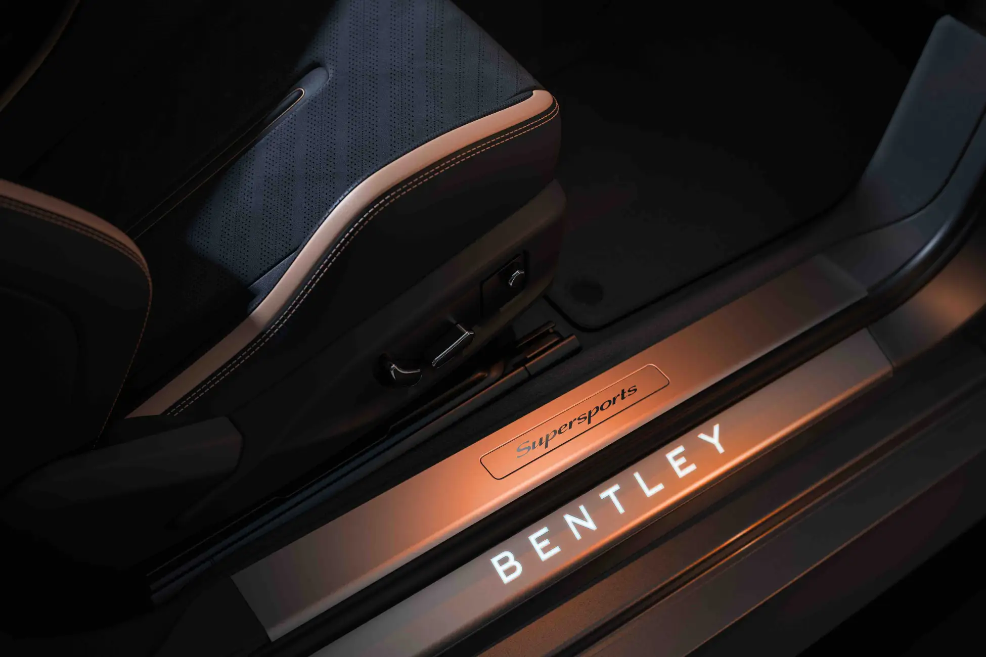 スーパースポーツ発表時のイメージは、「Nightfall(ナイトフォール)」と呼ばれるデザインテーマで、アンスラサイト・グロスの外装塗装に、ロアボディのキャメルアクセント、キャメルのロアストライプ、さらにグリルにはコントラストの“8”が組み合わされています。インテリアはベルーガとキャメルの組み合わせで、ブロンズのアクセントが添えられています。