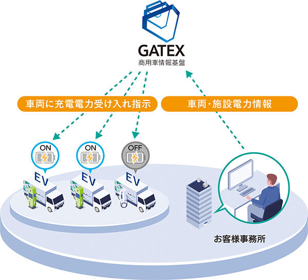 本サービスでは、アイ・グリッド・ソリューションズのエネルギーマネジメントプラットフォーム「R.E.A.L. New Energy Platform®*2」が施設の電力使用量の実績・予測データを分析します。その結果は、いすゞの商用車情報基盤「GATEX*3」に連携され、GATEXが各車両に必要となる最適な充電量を算出し、各車両へ充電の受け入れ量を指示します。これにより、各車両側で指示通りの受け入れ量で充電し、施設全体の電力ピークの超過を抑制します。また、エルフEVには通信で充電のON/OFFを制御する機能が備わっているため、充電器と車両の紐づけが不要となり、任意の駐車スペースで充電管理が可能です。