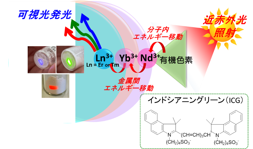 アップコンバージョンとは、2つ以上の光子が連続して吸収されることで、励起波長よりも短波長の光が放出される現象であり、近赤外光などの低いエネルギーの光を可視や紫外光といった高いエネルギーに変換することができる。代表的な機構として、有機系材料の二光子吸収や三重項―三重項消滅、希土類イオンを含むナノ粒子の多段階励起などが挙げられ、古くから研究が行われている。
