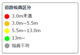 指定した地点の周辺500m範囲内の道路幅を色分けで可視化 |