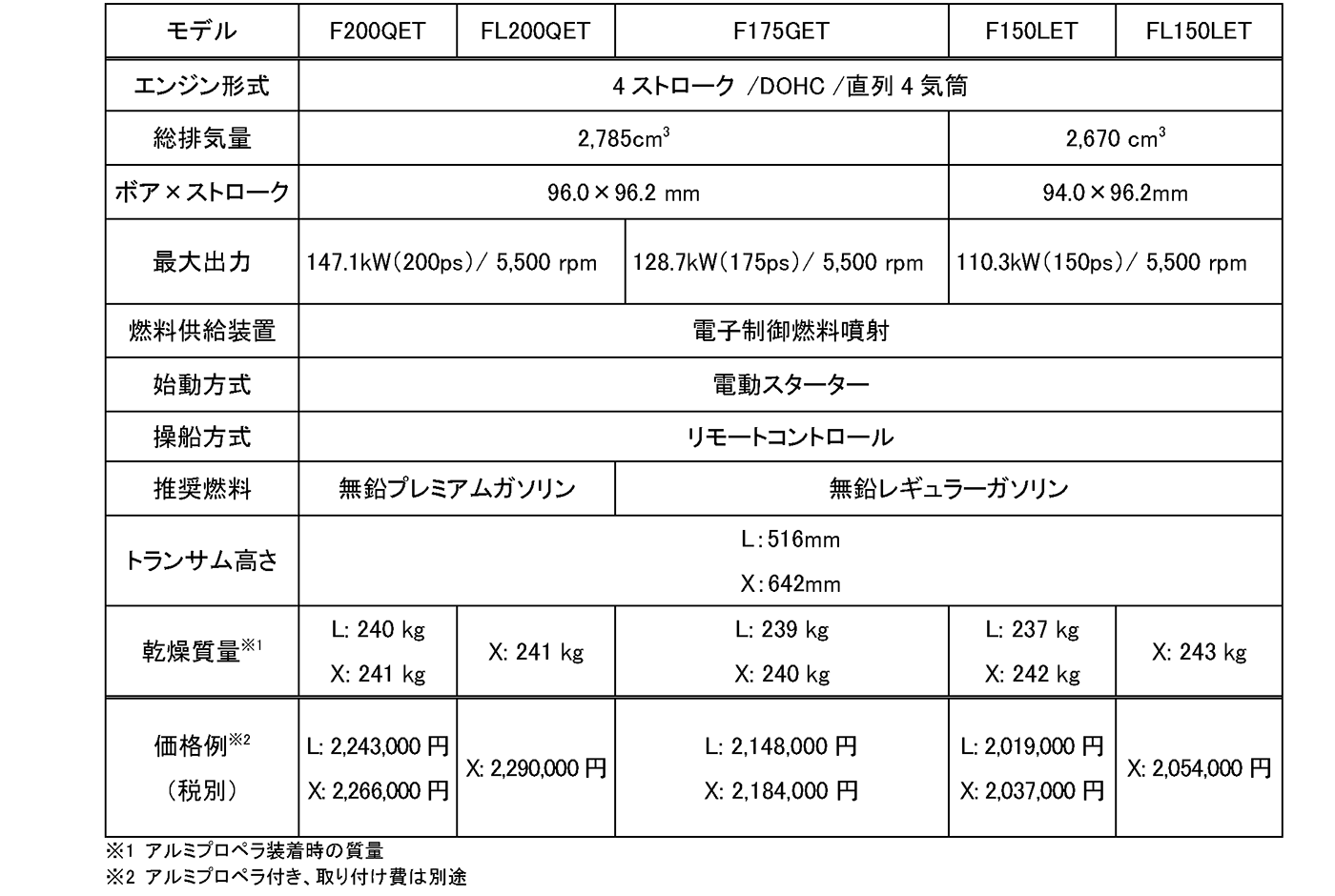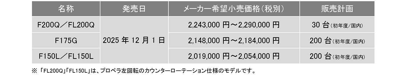 【主要諸元と価格例 「F200Q」「FL200Q」「F175G」「F150L」「FL150L」】