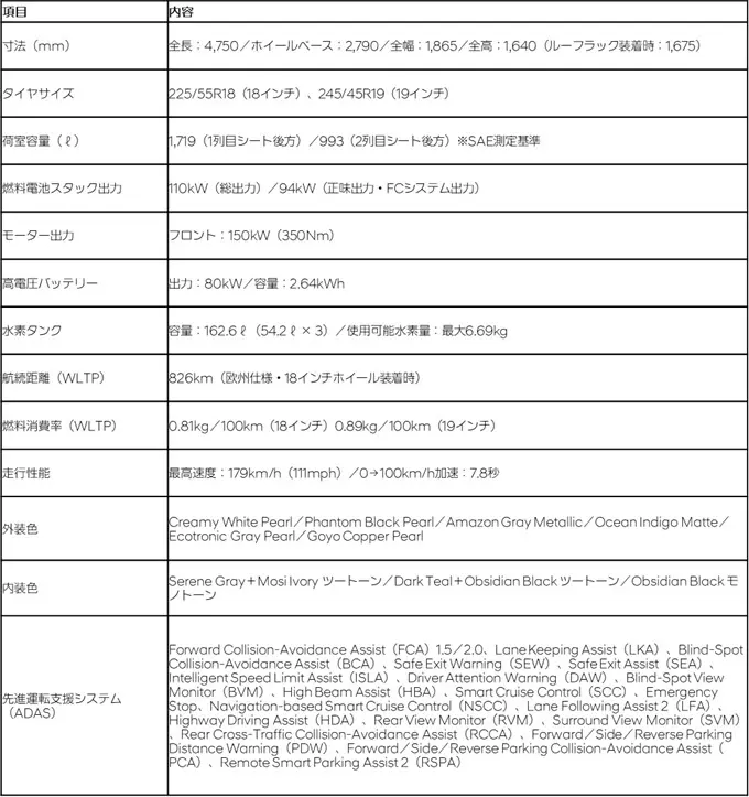 【新型「NEXO」主要諸元】