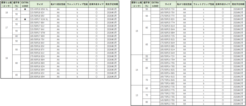『ENASAVE EC205』は、低燃費性能とロングライフ性能を維持しながら、雨天時の安全性を高めるウエット性能を強化したタイヤです。従来品『ENASAVE EC204(エナセーブ イーシーニーマルヨン)』から低燃費性能および耐摩耗性能を維持しています。さらに、新開発ゴムの採用により全50サイズ中27サイズがウエットグリップ性能”b“を取得し、従来品『ENASAVE EC204』と比較してウエットブレーキ性能を約6%向上させています。全50サイズのラインアップで、コンパクトカーからセダンまで幅広い車種に対応します。