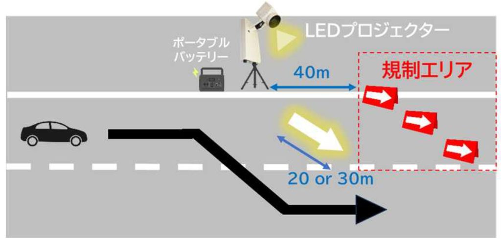 実証では、運転中に瞬時に認識可能な車線誘導表示として「路面投映技術」に着目し、複数の投映機器を比較する形でその視認性や有用性を評価しました。