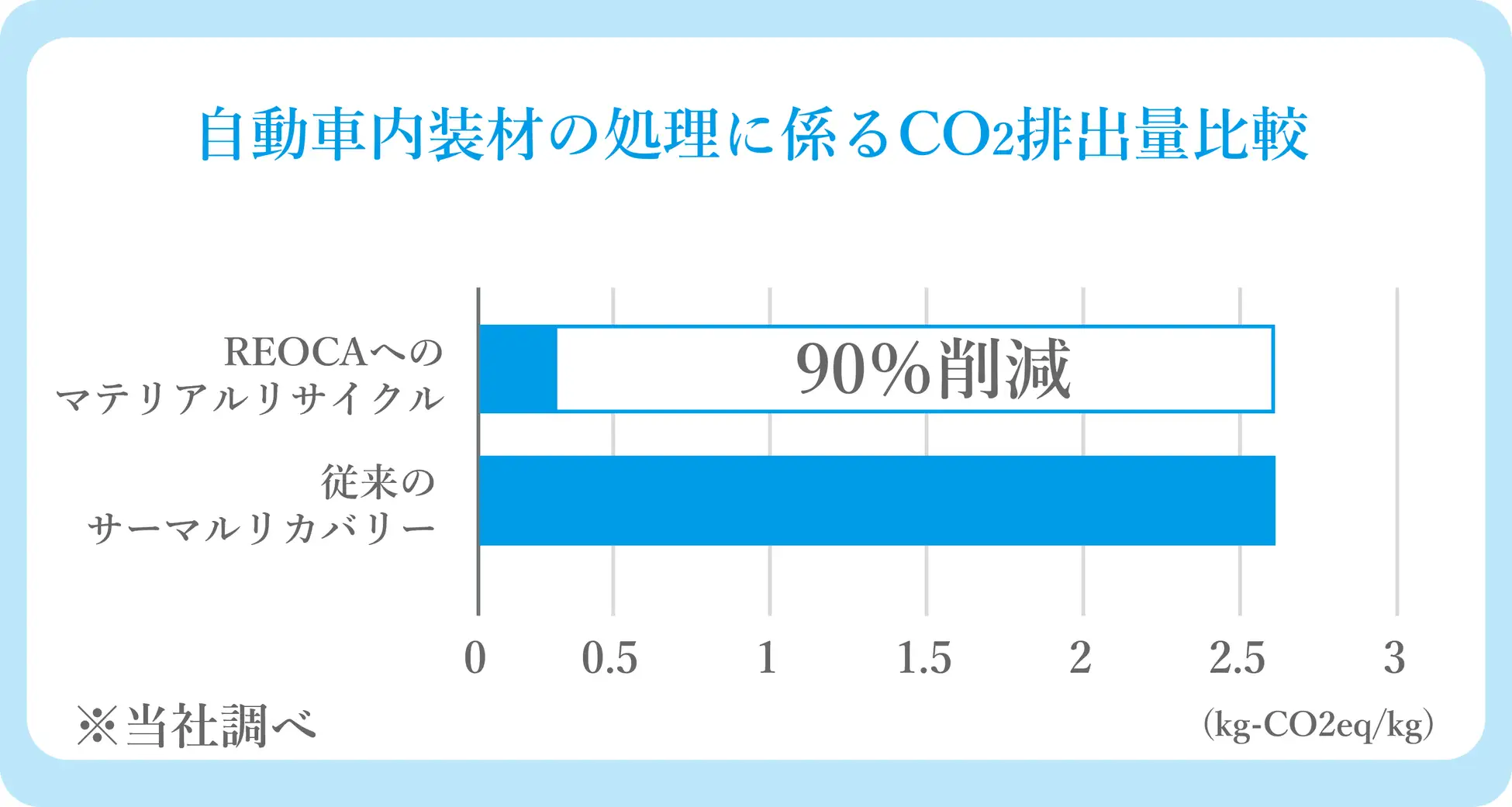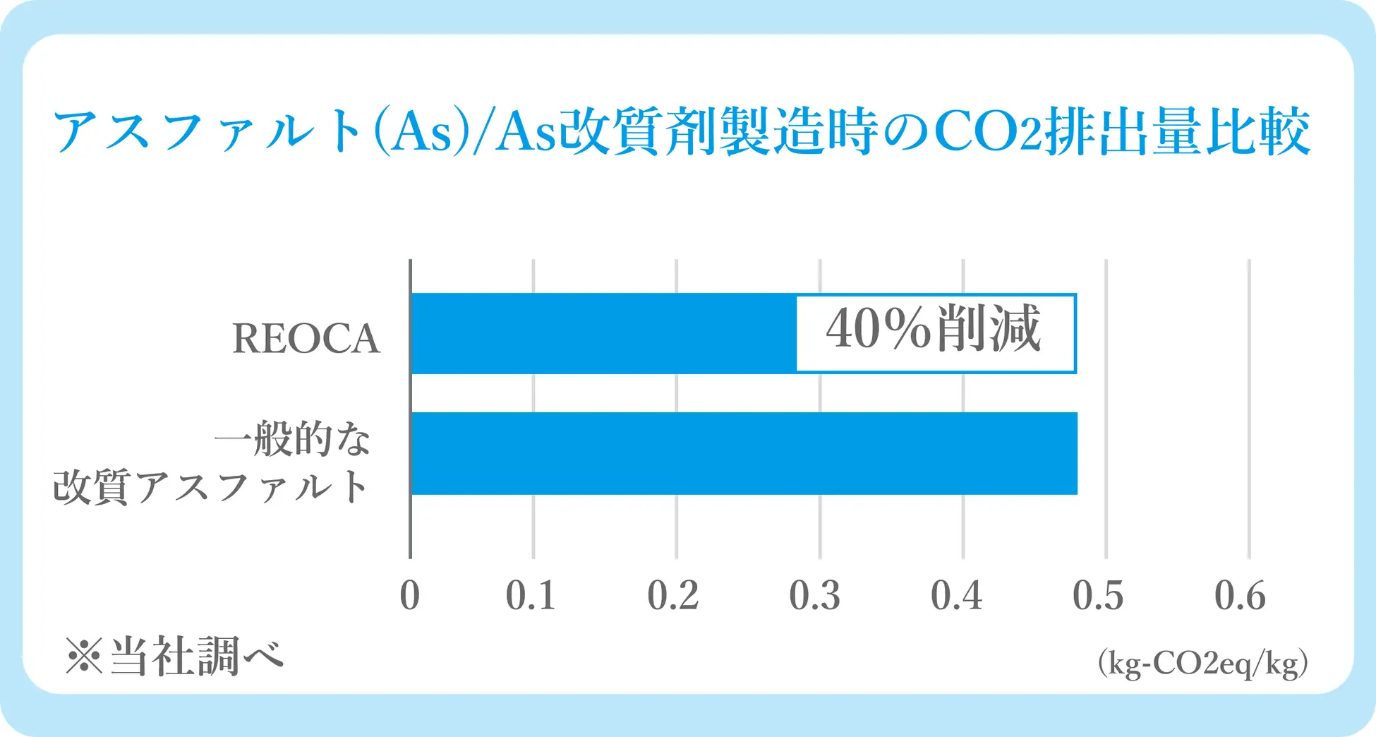 自動車内装材の処理を、従来のサーマルリカバリーからマテリアルリサイクルへと転換することで、約90%のCO2排出抑制を実現しました※3(図2)。さらに、「REOCA」を使用することで、アスファルト製造時においてもバージン由来の改質アスファルトと比べて約40%のCO2削減が可能です※4(図3)。