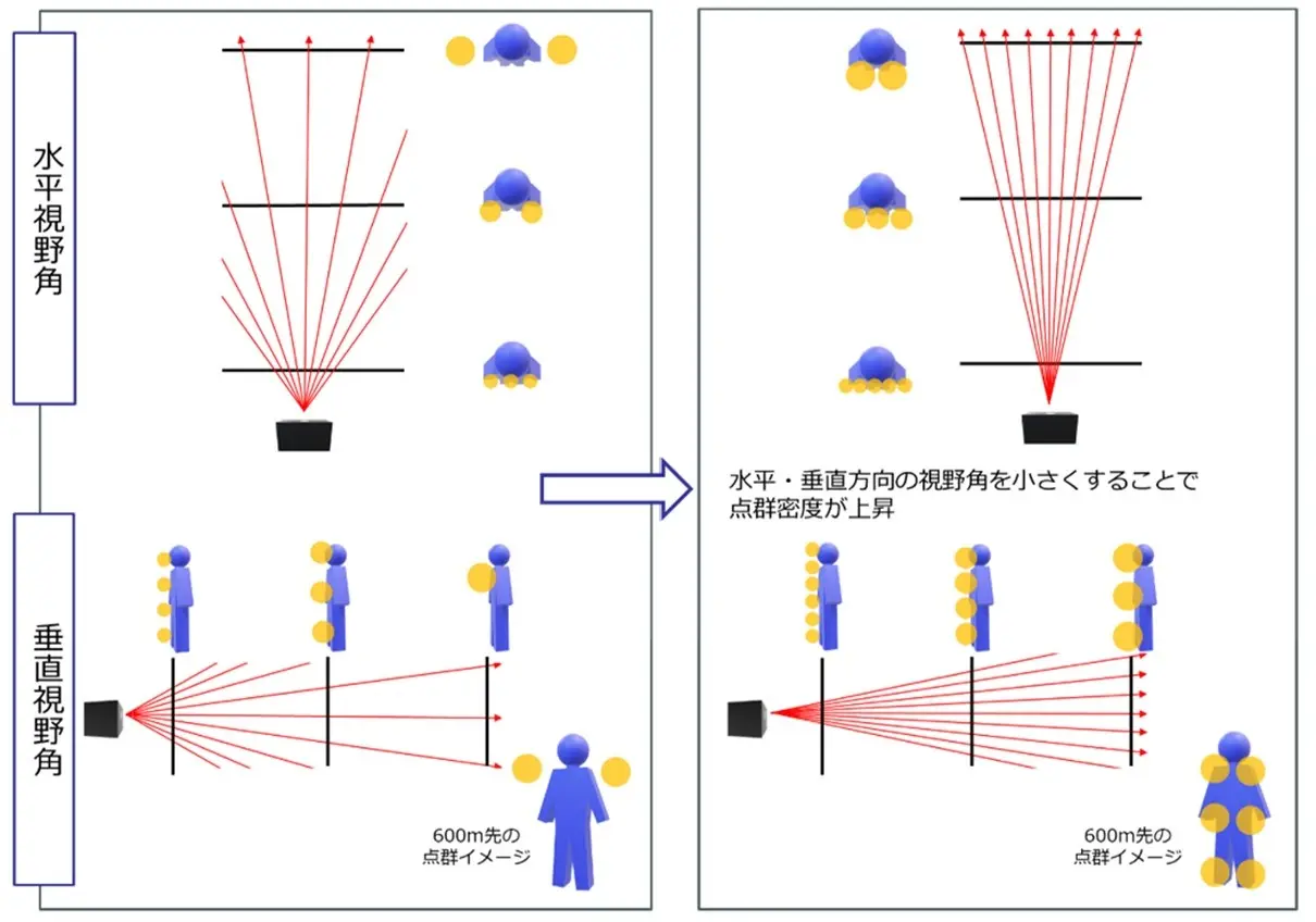 1.視野角を小さく設定し点群密度を高めることで、遠方の対象物を検知可能