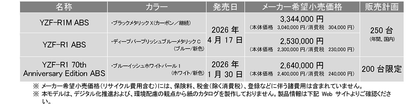 ヤマハ発動機販売株式会社は、クロスプレーン型クランクシャフトを備えた水冷・4ストローク・DOHC・直列4気筒・997cm³エンジンを搭載したスーパースポーツ「YZF-R1 ABS」のカラーリングを変更し、4月17日に発売*します。また、2025年にヤマハ発動機創立70周年を迎えたことを記念した「70th Anniversary Edition」を200台限定で1月30日に発売します。