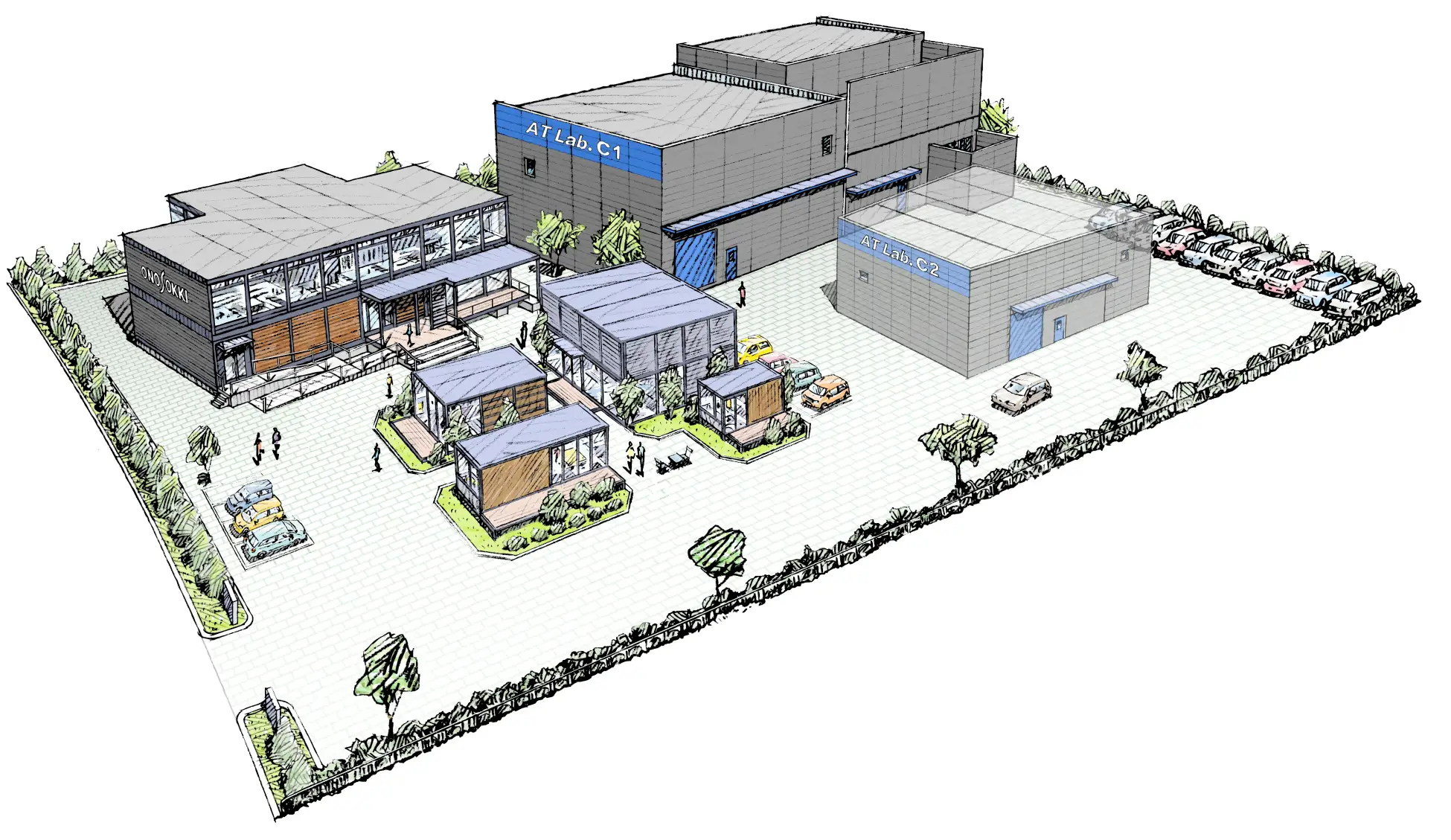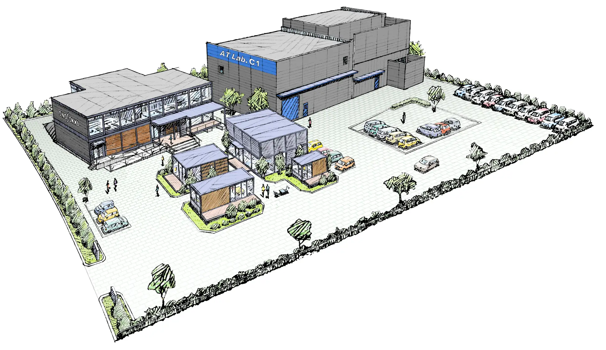 CLCは本館と実験棟で構成されており、実験棟には静粛性に優れたNC-30相当※1の車両ごと搬入可能な大型半無響室と、台上試験において路面状況を再現する「RC-S(Real Car Simulation Bench)」を組み合わせた最先端の実験室を設置する予定です。また東京大学と現在進めている「社会連携講座」を通じて、電動車両の振動計測制御に関する共同研究を進めています。この取り組みで得られた世界最高レベルの制御技術を、試験設備に順次実装していきます。CLCでは、2027年秋の稼働後、本館、実験棟とは別にユニットハウスで構成された「共創ヴィレッジ」を設け、共創パートナーが集う場を設ける予定です。その他、本事業は、2025年3月に愛知県豊田市の「豊田市企業立地奨励事業者※2」に指定されました。