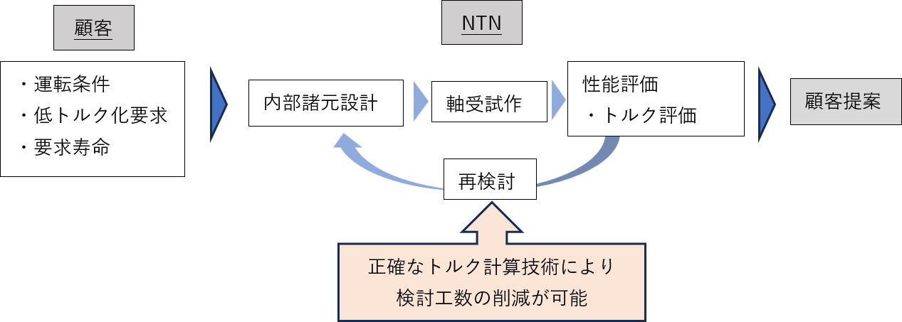 軸受トルクは適用されるアプリケーションのパフォーマンスや省エネルギー性などに大きく関わる性能で、お客さまのアプリケーションに軸受を適用した際の軸受トルクは、通常、軸受メーカーが自社で開発した計算プログラムを用いて行います。