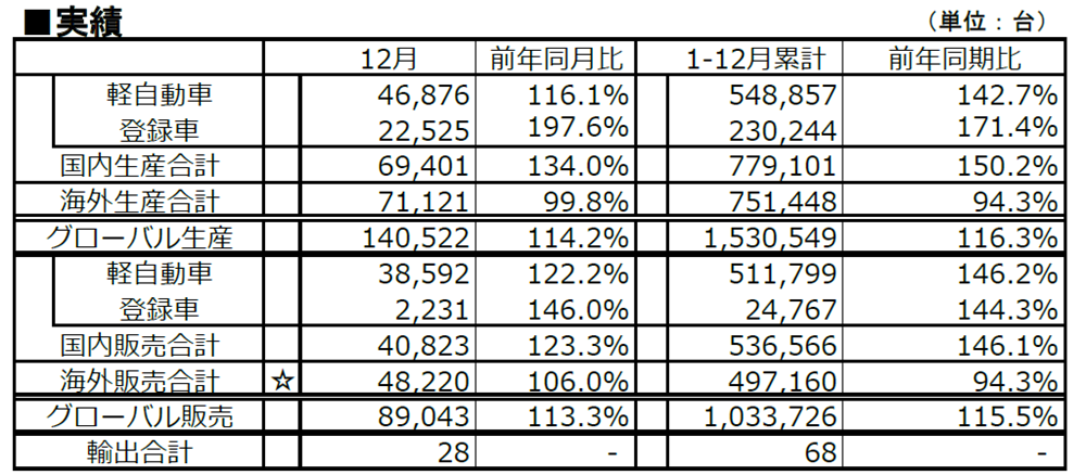 2025年12月および1-12月 生産・販売・輸出実績【ダイハツ工業】