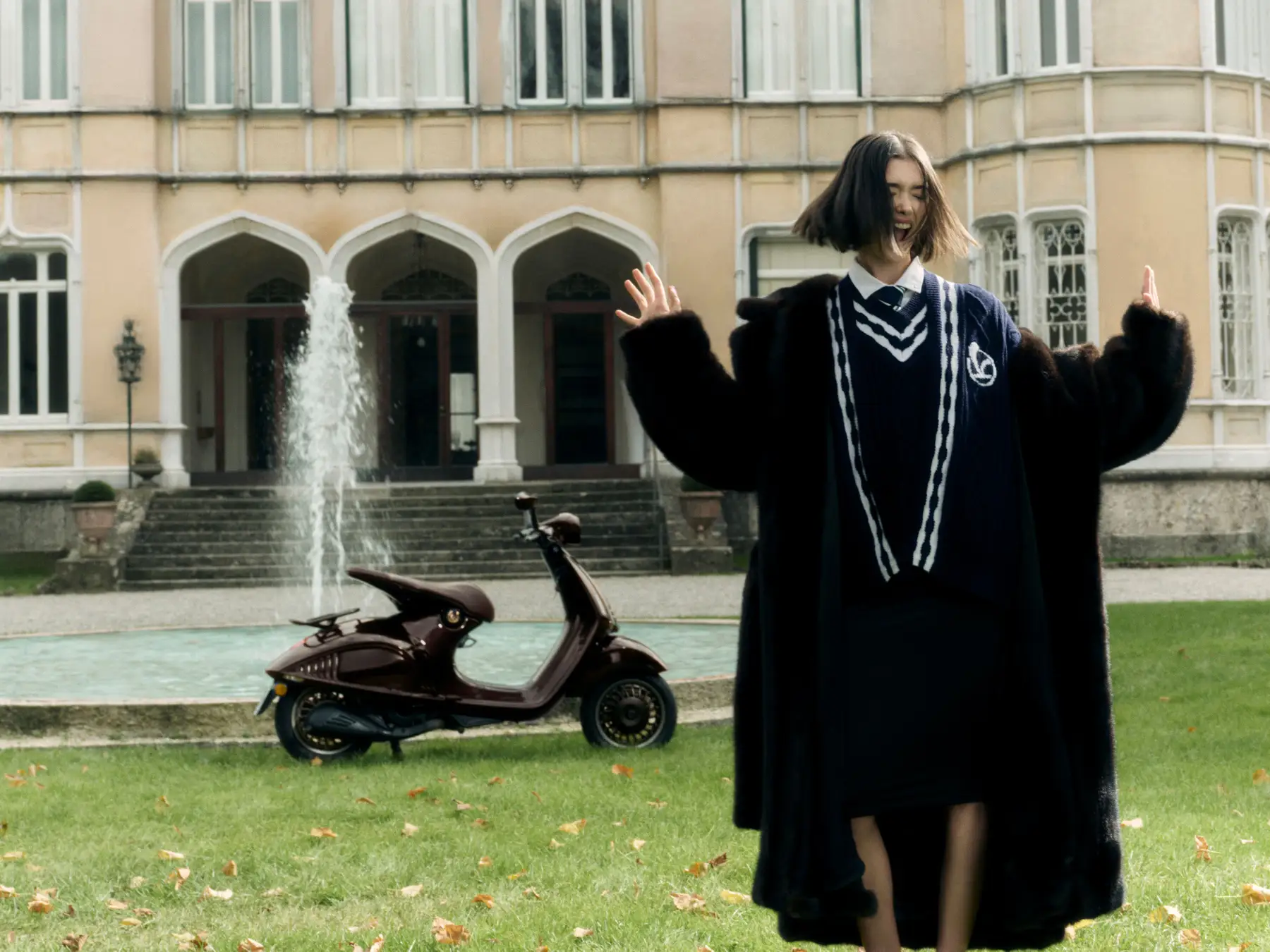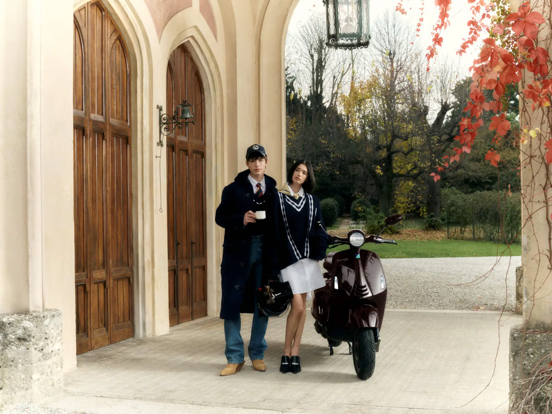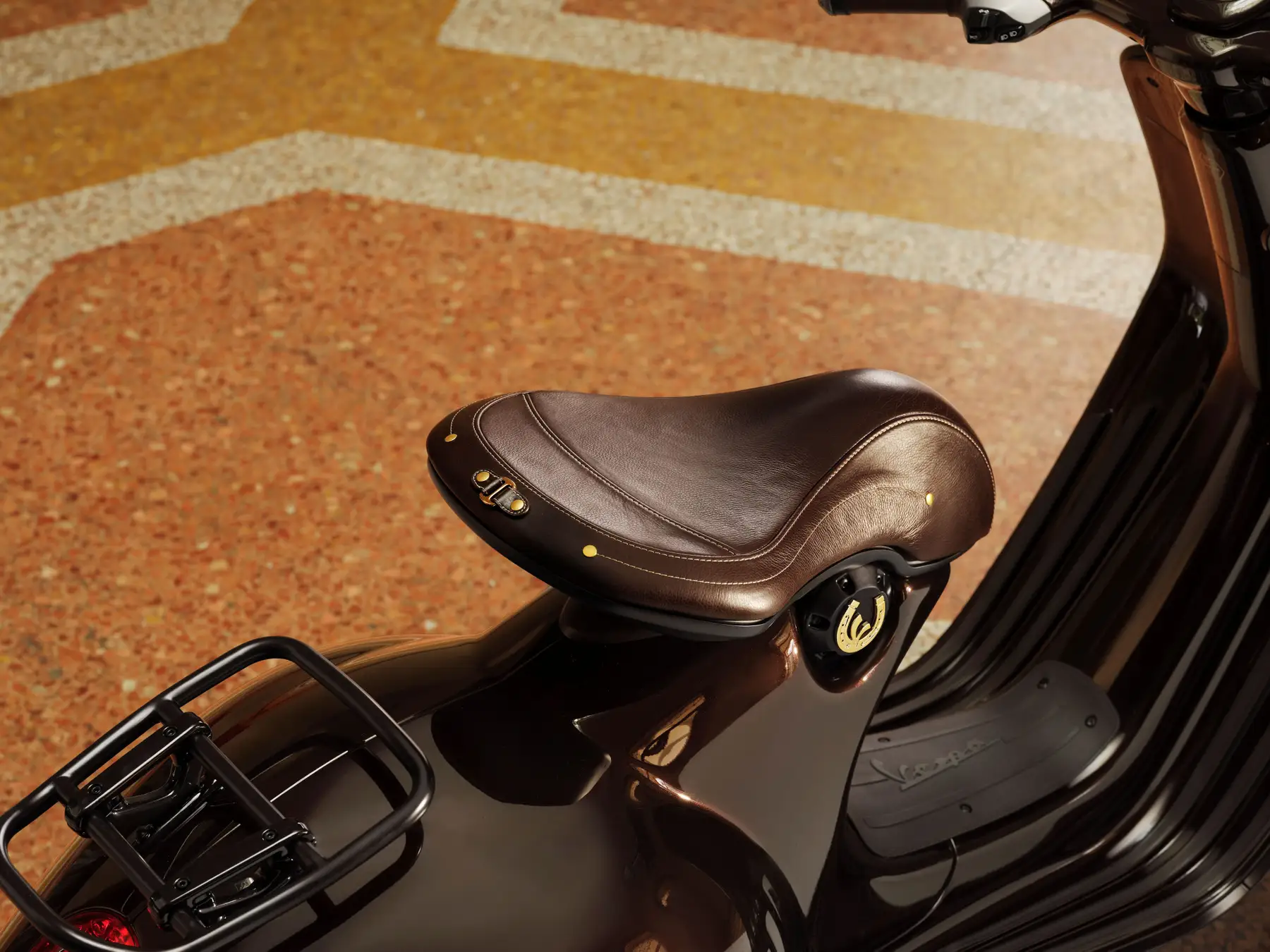このモデルのボディカラーは、馬の光沢のある濃い栗毛色を彷彿とさせる深みのあるペイントが特徴で、マットとグロス仕上げのコントラスト、そしてシート下にはVespaの「V」を囲む金色の蹄鉄をあしらった象徴的なディテールが施されなど、洗練されたゴールドのディテールを巧みに取り入れ、乗馬用の鞍を思わせる革製のシートに加え、上質なレザーを巻いたハンドルバーグリップとミラーステムなど、イタリアの卓越した職人技が新しい Vespa 946 に優雅さと個性が融合しています。