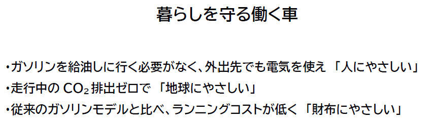 ・ガソリン代に比べ走行に係るコストが低く、毎日同程度の距離を走行する場合は経済的。また、オイルなどの消耗品が少なくメンテナンスの手間が省けるためランニングコストも低く、長期保有でも安心